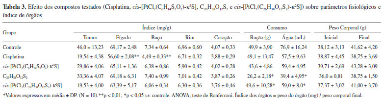 Os compostos de platina sintetizados apresentaram ausência de óbitos nos grupos tratados e percentual de inibição tumoral satisfatório, segundo modelo animal testado. Segundo análise macroscópica dos animais, submetidos ao tratamento quimioterápico durante 7 (sete) dias, todos apresentaram ganho de massa corpórea (mesmo debitando-se contribuição da massa tumoral) (Tabela 3) e não apresentaram alterações de pêlo (queda, espessamento e piloereção). Os parâmetros fisiológicos observados pelo consumo de água e ração não apresentaram diferença significativa entre os grupos tratados. Apesar disso, observa-se que o grupo tratado com o composto cis-[PtCl2(C26H38O12S2)-κ2S] apresentou menor consumo de água e ração, o que afetou no baixo ganho de peso corporal. Avaliando os índices dos órgãos, observa-se uma pequena atrofia do fígado e baço no grupo tratado com cisplatina, associado à alta toxicidade apresentado por esse complexo. No caso dos complexos cis-[PtCl2(C6H14S2O2)-κ2S] e cis-[PtCl2(C26H38O12S2)-κ2S] não foram observados alterações significativas com relação aos índices dos órgãos.