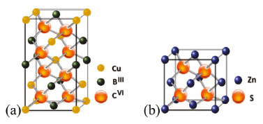 ![]() Figura 2. Representação esquemática de células unitárias de calcopirita (a) e blenda de zinco (b)