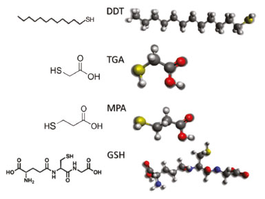 ![]() Figura 3. Representação bidimensional e tridimensional dos ligantes DDT, TGA, MPA e GSH