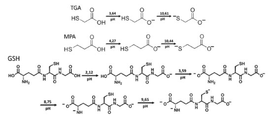 É importante destacar que para o uso dos ligantes em meio aquoso é necessário fazer o controle do pH do meio reacional, uma vez que em meio com pH superior ao relacionado às constantes de dissociação ácida (Ka) dos grupos, é esperado que os grupos se encontrem desprotonados.43 Isso possibilita a interação tanto com os PQs quanto com o solvente (água). A relação de desprotonação dos ligantes TGA, MPA e GSH com o pH é apresentada na Figura 4. Sendo o enxofre menos eletronegativo que o oxigênio, tióis não fazem ligações de hidrogênio fortes, e consequentemente, têm atrações intermoleculares mais fracas, não são muito bem solvatados em solventes próticos (como a água), podendo ser bons nucleófilos48 e interagirem mais facilmente com ácidos moles, sendo possivelmente a extremidade que interage com os PQs. Representações ilustrativas dos PQs, tanto com ligante de cadeia longa (para meio orgânico), quanto com ligante de cadeia curta (para meio aquoso, com e sem solvatação), são apresentadas na Figura 5.