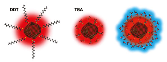 ![]() Figura 5. Representação dos PQs estabilizados com os ligantes DDT e TGA (sem e com solvatação, respectivamente)