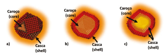 ![]() Figura 6. Esquemas de estruturas do tipo caroço/casca, representação tridimensional (a) e em um corte bidimensional, com uma camada de casca (b) e com duas camadas de casca (c)