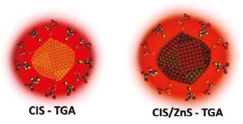 ![]() Figura 7. Representação ilustrativa de PQs caroço e caroço/casca, respectivamente, de CIS com o ligante TGA e camada de ZnS