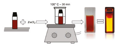 Após a síntese do caroço de CIZS, uma camada fina de ZnS (casca) é crescida nos nanocristais. O uso da casca para o encobrimento dos nanocristais é uma tática altamente utilizada, uma vez que o uso da estrutura caroço-casca possibilita a obtenção de materiais com características melhores. Para a adição da casca, 40 µL de cloreto de zinco (0,5 mol L-1) foram adicionados a 5 mL da solução dos PQs, que foi mantida a cerca de 100 °C, em banho-maria, durante 30 min (Figura 9). Como fonte de enxofre para a casca, os próprios nanocristais foram utilizados, de forma que somente íons de zinco foram adicionados à solução.