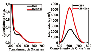 ![]() Figura 10. Espectros de absorção e emissão, respectivamente, para os PQs CIZS sintetizados, com e sem a adição da casca de ZnS