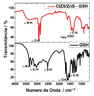 ![]() Figura 12. Espectros vibracionais na região do infravermelho do ligante de superfície GSH e dos PQs passivados com GSH