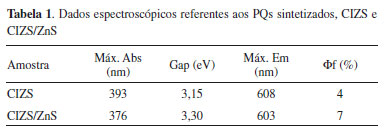 Os espectros de absorção e emissão evidenciam a formação do material fotoluminescente, que absorve e emite na região do visível do espectro eletromagnético. O material mostra-se um bom absorvedor, absorvendo em uma ampla faixa do visível. Informações referentes à energia de banda proibida podem também ser obtidas por meio dos espectros de absorção dos materiais, e os dados obtidos estão apresentados na Tabela 1. A banda centralizada em 393 nm (3,15 eV) para o CIZS e em 376 nm (3,30 eV) para o CIZS/ZnS, é associada à primeira transição exitônica dos PQs.55 Os materiais apresentaram emissão na região do laranja, com máximos em torno de 603 e 608 nm. O aumento da intensidade relativa de emissão indica a efetividade da formação da casca, pela melhoria da propriedade relativa à emissão dos nanocristais sintetizados, representadas também pelo rendimento quântico, apresentado na Tabela 1, indicando a melhoria das propriedades de superfície dos materiais. Foi observado um aumento da capacidade de emissão para quase o dobro do rendimento quântico, pela adição da casca.
