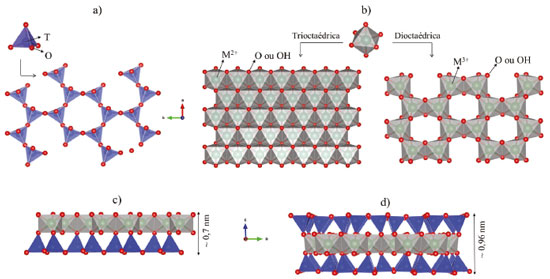 ![]() Figura 1. Representação das folhas a) tetraédrica, b) octaédrica, e das lamelas c) 1:1 e d) 2:1 dos argilominerais (Figura gerada com o programa VESTA 3 - gratuito)97