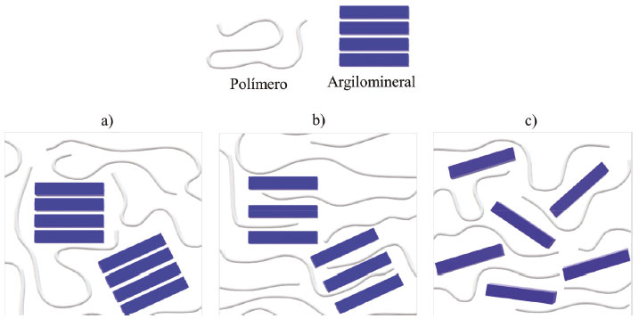 ![]() Figura 2. Representações idealizadas do a) microcompósito argilomineral/polímero (estrutura de fase separada) e nanocompósitos argilomineral/polímero com estrutura de fase b) intercalada ou delaminada e c) esfoliada (Figura gerada com o programa CorelDRAW Graphics Suite 2020 - versão de avaliação gratuita)
