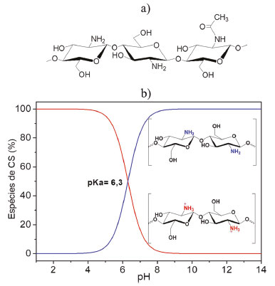![]() Figura 3. a) Estrutura do fragmento da cadeia polimérica da CS e b) diagrama de variação das espécies de CS em função do pH (Figuras geradas com os programas a) ChemSketch versão gratuita e b) OriginPro® 2020 - versão de avaliação gratuita)