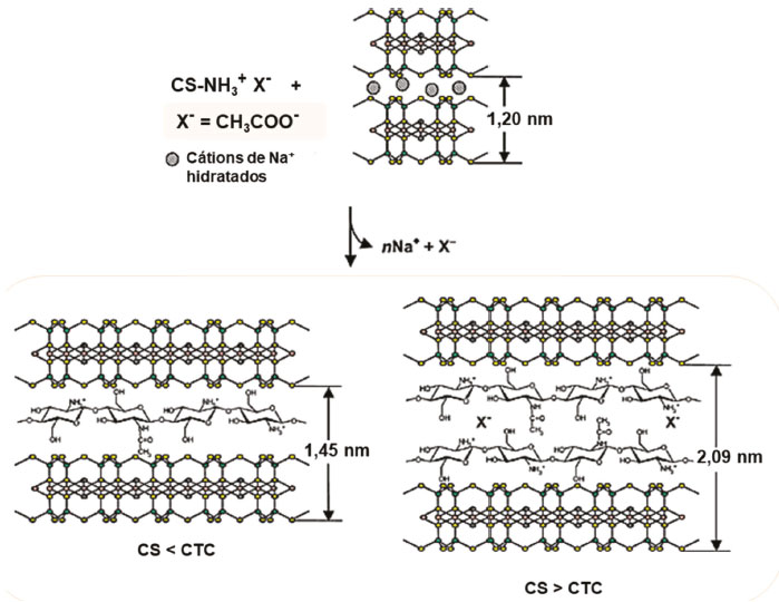 A extensa utilização do biopolímero deve-se, principalmente, à presença de grupos funcionais em sua estrutura (-OH e -NH2), os quais são responsáveis pela interação com diversas espécies de natureza orgânica ou inorgânica,121-124 além de propriedades como bioadesão, biocompatibilidade e atividades antibacteriana e antifúngica,90,94,125 que conferem a CS elevado potencial em diversas aplicações biomédicas e farmacológicas.58,126-129 Quando dissolvida em soluções aquosas de ácidos diluídos (pH < pKa), adquire caráter catiônico, devido à protonação dos grupos amino (pka ≈ 6,3) (Figura 3b),119,130 e torna-se capaz de interagir com argilominerais expansíveis, como a Mt, por intermédio da intercalação por reações de troca iônica, derivando a formação de bionanocompósitos poliméricos. O mecanismo de intercalação envolve, principalmente, a interação eletrostática entre os grupos amino protonados e as lamelas negativamente carregadas do argilomineral, além de formação de ligações de hidrogênio e outros tipos de interação.20,40 A síntese do primeiro bionanocompósito polimérico baseado em CS e Na-Mt foi descrita por Darder et al.,46 a partir de diferentes proporções CS/Mt em relação à capacidade de troca catiônica (CTC) do argilomineral (76,4 cmol(+) kg-1). Diferentemente da maioria dos nanocompósitos poliméricos, onde o argilomineral é disperso em pequenas quantidades no polímero, os bionanocompósitos poliméricos desse estudo foram obtidos como produto da reação de modificação orgânica da Mt com a CS, originando híbridos de intercalação com maior proporção do argilomineral. Os difratogramas de raios X mostraram que quando uma quantidade de CS inferior à CTC foi incorporada na Mt, a variação do valor do espaçamento basal d001 (1,20 para 1,45 nm) foi concordante com a intercalação do biopolímero em uma configuração de monocamada. Tendo em conta que a espessura de uma lamela da Mt é cerca de 0,96 nm, atesta-se que o espaço disponível na região interlamelar (ΔdL = 0,49 nm) é capaz de acomodar uma camada do polissacarídeo, com espessura igual a 0,38 nm. A formação dos híbridos foi acompanhada pelo deslocamento da banda referente à deformação dos grupos NH3+ nos espectros de infravermelho para menores números de onda, como resultado da interação eletrostática do biopolímero com a Mt. Contudo, esse deslocamento mostrou-se dependente da quantidade de CS adsorvida no argilomineral, e aproximou-se do valor encontrado para os filmes do biopolímero puro (1560 cm-1) quando a quantidade incorporada foi superior à CTC. Nessa condição, o aumento do valor do espaçamento basal (d001 = 2,09 nm) correspondeu à intercalação de duas camadas de CS juntamente com os ânions acetato (ΔdL = 1,13 nm), compensando a carga excedente do biopolímero intercalado, redundando em uma capacidade de troca de ânions no bionanocompósito formado (57,1 cmol kg-1). Um esquema representativo é mostrado na Figura 4.