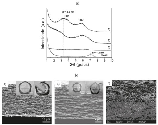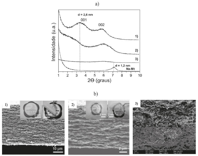 ![]() Figura 5. a) Difratogramas de raios X e b) imagens obtidas por MEV da secção transversal dos filmes obtidos pelo método de automontagem induzido por 1) filtração a vácuo e 2) evaporação, e do 3) filme preparado pelo método convencional de simples mistura dos constituintes (Adaptada com permissão da referência 47. Copyright (2010) John Wiley and Sons)