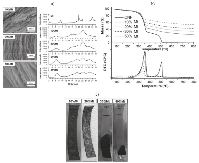 Nessa perspectiva, Carosio et al72 investigaram os principais mecanismos de proteção contra chama em filmes de celulose nanofibrilada e Mt (10 a 50% em massa), com estrutura do tipo tijolo e argamassa, por meio de termogravimetria (TG), testes de inflamabilidade e calorimetria do cone. A formação de nanoestruturas lamelares ordenadas e de intercalação do biopolímero entre as lamelas da Mt foi observada por meio de imagens obtidas por MEV e pelos difratogramas de raios X, respectivamente (Figura 7a).