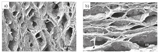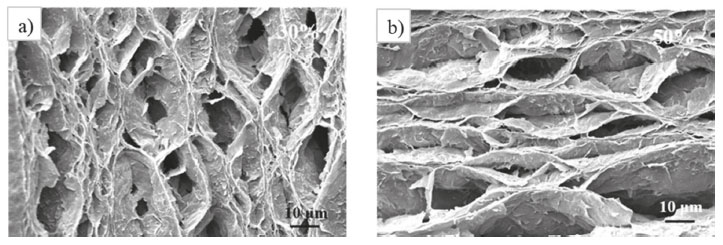 ![]() Figura 8. Imagens obtidas por MEV da seção transversal dos filmes de celulose/Mt submetidos ao teste de chama contendo a) 30% e b) 50% em massa de Mt (Adaptada com permissão da referência 70. Copyright (2017) American Chemical Society)
