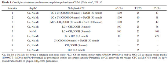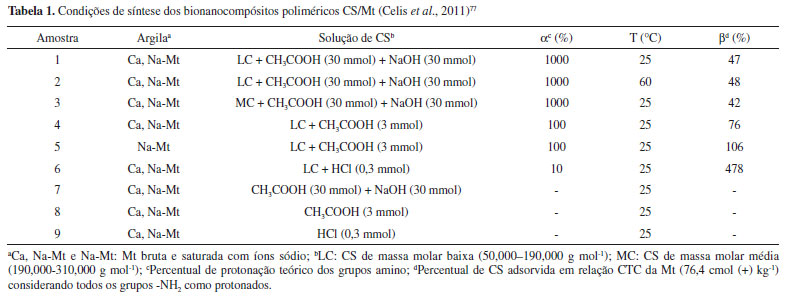 As diferentes estruturas e morfologias adquiridas exercem influência direta nas propriedades finais dos bionanocompósitos poliméricos, e a compreensão acerca de como elas são afetadas tem sido alvo de investigações. Nessa direção, Branca et al.67 adotaram a técnica de espectroscopia de infravermelho com transformada de Fourier e reflectância total atenuada (FTIR-ATR) como ferramenta para investigar como as diferentes nanoestruturas formadas nos filmes de CS contendo 2,5 e 5% em massa de Mt estão relacionadas com a capacidade de intumescimento exibidas pelos respectivos bionanocompósitos poliméricos. A análise foi dedicada especialmente à região dos espectros referente às vibrações de estiramento O-H e N-H (3000-3750 cm-1), e quando comparadas aos espectros de infravermelho do filme de CS pura revelaram que na estrutura intercalada (5,0% em massa de Mt) há uma redução das ligações de hidrogênio inter e intramoleculares envolvendo os grupos hidroxila da CS, devido ao arranjo adotado pelas cadeias do polissacarídeo entre as lamelas da Mt, que tendem a maximizar a superfície de contato. Como consequência, os grupos OH ficam disponíveis para interagir com as moléculas de água e uma capacidade mais elevada de intumescimento é exibida pelo bionanocompósito. Porém, quando a dispersão homogênea das lamelas do argilomineral ocorre em uma estrutura esfoliada (2,5% em massa de Mt), os grupos OH da CS estão, provavelmente, envolvidos em uma rede de ligações de hidrogênio e, como consequência, o efeito de intumescimento em água é reduzido. Diante da relação entre estrutura e propriedades, o efeito da variação da quantidade das matrizes iniciais, condições experimentais (temperatura e pH, condições de preparação da solução da CS), características da CS (massa molar e grau de desacetilação) e da Mt (carga lamelar, CTC e cátions interlamelares) vem sendo averiguado na obtenção dos respectivos bionanocompósitos poliméricos.68,76,77,133,134 A influência da relação em massa CS/Mt nas propriedades de superfície dos bionanocompósitos poliméricos foi avaliada por Bensalem et al.68 por intermédio de medidas de adsorção/dessorção de N2, espectroscopia de fotoelétrons de raios X (XPS) e cromatografia de gás inversa de diluição infinita (IGC-ID) e concentração finita (IGC-FC). Os sólidos foram preparados seguindo a metodologia de Darder et al.,46 utilizando razões CS/Mt em massa de 0,1/1, 0,5/1, 1/1 e 2/1. A intercalação do biopolímero entre as lamelas da Mt foi confirmada pelos resultados obtidos por DRX, a partir do aumento da distância basal de 1,18 nm (Mt) para 1,46 e 1,54 nm, quando a menor e maior razão CS/Mt foram utilizadas, respectivamente. A composição química determinada por XPS revelou que a superfície dos materiais híbridos é constituída, principalmente, pelo material inorgânico, e a partir das medidas de adsorção/dessorção de N2, uma diminuição da área superficial específica (ABET) dos sólidos, com o aumento do teor de CS, foi percebida, revelando uma redução de até 50,5 m2 g-1 em relação à Mt, atribuída à quantidade crescente de biopolímero intercalado. Os resultados atingidos pelas análises de IGC-ID e IGC-FC sugeriram que a interação da CS com a Mt leva a uma diminuição dos sítios energéticos e da heterogeneidade de superfície do argilomineral com o aumento da quantidade de CS. Ademais, os valores de ABET obtidos pelo uso de sondas de n-octano e isopropanol na análise de IGC-FC exibiram um comportamento semelhante ao das isotermas de adsorção/dessorção de N2. Visando a uma compreensão mais aprimorada acerca dos fatores que interferem na reação de intercalação da CS na Mt, Celis et al.77 avaliaram parâmetros como temperatura, natureza da amostra de Mt (composição dos cátions interlamelares), solução e massa molar do biopolímero, mantendo a quantidade de CS (500% do valor da CTC) inicial fixa (Tabela 1). Para mais, as amostras de controle foram preparadas (7, 8 e 9) sem a adição de CS, a fim de avaliar as possíveis alterações ocorridas devido aos diferentes procedimentos de preparação.