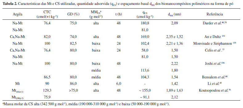 Dessa forma, a quantidade de ácido utilizada na solução do biopolímero foi escolhida com base no percentual de protonação teórico (α) dos grupos amino, e o elevado percentual de adsorção da CS (β), quando a protonação foi de 10%, ocorreu, provavelmente, devido à necessidade de maior quantidade do biopolímero para contrabalancear a carga das lamelas da Mt. Entretanto, para o mesmo valor de α (amostras 4 e 5), a Mt saturada com Na+ apresentou maior percentual de CS adsorvida, quando comparada com a amostra bruta, que possui Ca2+ e Na+ como cátions interlamelares, patenteando que estes influenciam na capacidade de incorporação do biopolímero na Mt. Em função da similaridade entre os valores de espaçamento basal, os difratogramas de raios X foram obtidos para as amostras aquecidas a 200 °C, os quais mostraram reflexões basais em torno de 1,37 nm e 1,0 nm para os bionanocompósitos poliméricos, atribuídas à intercalação da CS em um arranjo de monocamada e presença de algumas lamelas nas quais não houve intercalação, respectivamente, enquanto a Mt e as amostras de controle apresentaram valores de d001 entre 0,96 e 1,0 nm. A variação de temperatura e massa molar da CS não foram parâmetros relevantes nas condições utilizadas, e as imagens colhidas por MEV para os bionanocompósitos poliméricos denotam que o biopolímero foi igualmente adsorvido na superfície externa da Mt. Nessa direção, Hu et al.134 examinaram o efeito do pH na interação entre a CS e Mt, utilizando amostras de CS de baixa e média massa molar (LC e MC), que foram dissolvidas em uma solução de HCl 1 mol L-1. Os resultados indicam que as quantidades de LC e MC adsorvidas aumentaram com o pH, sendo os valores máximos obtidos de 207 mg g-1 e 183 mg g-1, respectivamente, em pH 5,5, correspondendo a cerca de 120% do valor da CTC da Mt e atribuídas às diferentes contribuições da densidade de carga do biopolímero e ao efeito de competição com os íons H3O+ na faixa de pH de 3-5,5. Apesar do elevado valor de d001 observado para os bionanocompósitos poliméricos nos difratogramas de raios X obtidos a 40 °C (d = 1,77 e 1,80 nm para LC/Mt e MC/Mt), a intercalação de apenas uma monocamada de CS foi considerada, com base na diminuição do espaçamento basal com o aumento da temperatura. De fato, a literatura reporta que o início da degradação térmica da CS intercalada em Mt ocorre a cerca de 200 °C,46,68,115 temperatura na qual os bionanocompósitos poliméricos revelaram distâncias basais de 1,64 nm (LC/Mt) e 1,62 nm (MC/Mt), inferiores ao valor necessário para a acomodação de uma bicamada de polissacarídeo (d001 = 1,72 nm), porém maiores que os auferidos por Celis et al.,77 à mesma temperatura. Além dos parâmetros de quantidades dos constituintes e da massa molar do biopolímero, Lertsutthiwong et al.133 investigaram a influência do grau de desacetilação (GD) da CS (80 e 90%) nas características finais do bionanocompósito polimérico, a partir de uma razão CS/Mt em massa igual a 0,5/1. A variação do GD foi refletida principalmente na quantidade de CS adsorvida na Mt, que foi superior quando a CS com menor grau de desacetilação foi empregada. As características da Mt, como carga lamelar e CTC, podem influenciar de modo idêntico no arranjo interlamelar e na incorporação da CS.76 Neste estudo, foram aplicadas duas montmorillonitas de procedências distintas, Mt(SWy-2) com baixa carga lamelar e CTC = 75,9 cmol(+) kg-1 (Wyoming, EUA), e Mt(SAz-1) de alta carga lamelar e CTC = 129,3 (Arizona, EUA). Os bionanocompósitos poliméricos foram obtidos segundo a metodologia descrita por Darder et al.,46 utilizando diferentes quantidades de CS em relação à CTC (25-1000%) de cada amostra de Mt. Como a interação entre o biopolímero e a Mt é controlada, principalmente, por troca iônica, a amostra Mt(SAz-1), que possui elevadas CTC e carga lamelar, exibiu capacidade de adsorção máxima da CS de 160 mg g-1, superior ao valor observado para Mt(SWy-2) (115,0 mg g-1). Apesar da diferença entre os valores, a quantidade máxima de CS incorporada foi suficiente para exceder a CTC de cada amostra correspondente de Mt em, aproximadamente 20%, enquanto nos trabalhos de Darder et al.46 e An e Dultz131 esse excesso chegou a cerca de 75% e 51%, respectivamente. Ademais, as distâncias basais máximas dos bionanocompósitos poliméricos, de acordo com os resultados obtidos por DRX, foram 2,12 nm para Mt(SWy-2) e 1,89 e 1,63 nm para Mt(SAz-1), ilustrando que o arranjo do biopolímero na região interlamelar não está relacionado apenas à quantidade de CS incorporada, mas também à CTC e magnitude de carga lamelar de cada amostra de Mt.76 Diante dos resultados expostos pela literatura (Tabela 2), concebe-se que diversos fatores experimentais e estruturais podem influenciar a quantidade de CS intercalada na Mt e estrutura formada. Contudo, apesar de várias investigações, foi possível observar que mesmo conhecendo como alguns fatores experimentais e estruturais da CS e Mt podem direcionar certas propriedades finais dos bionanocompósitos poliméricos formados, a reprodutibilidade dos resultados entre os trabalhos torna-se difícil, mesmo quando condições de síntese similares são empregadas.