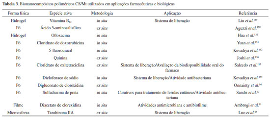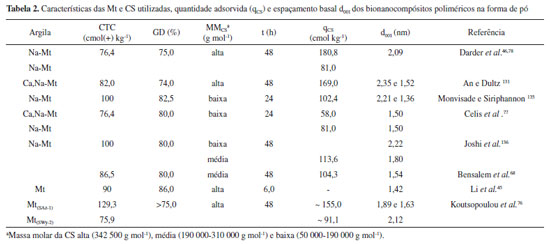 CONCLUSÃO Os bionanocompósitos poliméricos baseados em Mt oferecem uma alternativa viável em diversos campos de aplicação como substituintes ecológicos aos polímeros não biodegradáveis derivados de petróleo. Ademais, mostrou-se que a quitosana pode ser utilizada para atribuir novas funcionalidades ao bionanocompósito. A estrutura formada e a interação entre os constituintes estão diretamente relacionadas com as propriedades finais desses materiais, e alguns trabalhos são dedicados a desenvolver novas metodologias, visando a alcançar as características desejadas. Apesar de o tema já ser bastante discutido na literatura, os estudos estão geralmente focados na obtenção da composição ideal, de modo que haja um efeito sinérgico das propriedades dos materiais de partida, que é realizado variando a quantidade do argilomineral ou do biopolímero. Todavia, apenas algumas investigações se propuseram a compreender como a estrutura formada e as interações entre as espécies estão relacionadas com determinada propriedade do bionanocompósito polimérico e, na maioria das vezes, a justificativa utilizada tem sido o aumento do teor de Mt ou a diminuição da quantidade do biopolímero ou vice-versa, embora alguns estudos tenham revelado que nem sempre isso acontece. No que se refere aos bionanocompósitos poliméricos baseados em CS e Mt, diferentes comportamentos relacionados à estrutura formada têm sido relatados, principalmente entre os valores de espaçamento basal e a quantidade adsorvida. A despeito de essas mudanças poderem ser atribuídas às diferentes metodologias empregadas, as variações das características da Mt e da CS também devem ter contribuição nesse resultado. Vale salientar que por se tratar de um material natural, a Mt geralmente está presente na argila junto com outras fases, podendo apresentar diferentes capacidades de troca catiônica, carga lamelar e cátions interlamelares (Na+ e/ou Ca2+ ou, ainda, Mg2+), inclusive conter impurezas de outros metais em sua composição, enquanto as variações observadas para CS estão relacionadas ao grau de desacetilação e à massa molar. Dessa forma, cada sistema proposto é particular, necessita ser devidamente caracterizado e talvez não haja uma metodologia fixa para obter um material com determinada característica. Como observado, os sistemas baseados em CS têm sido mais explorados pela literatura do que aqueles envolvendo celulose. Uma das dificuldades para se trabalhar com a celulose diz respeito à sua alta estabilidade e baixa solubilidade, de modo que para solubilização e obtenção do nanocompósito geralmente é necessário o uso de solventes iônicos polares (LiOH/uréia, LiCl/N,N-dimetilacetamida, entre outros) ou líquidos iônicos, como o acetato de 1-etil-3-metilimidazólio, além de uma etapa de regeneração na qual etanol e acetona, entre outros, são empregados. Por esse motivo, dependendo da aplicação, torna-se mais vantajosa a utilização de derivados solúveis da celulose. Sem embargo, a funcionalidade dos bionanocompósitos poliméricos é fato e seu campo de aplicação é amplo, envolvendo áreas ambientais, biológicas, farmacêuticas, catalíticas, além de serem utilizados, igualmente, na agricultura, na indústria de alimentos e embalagens, e no desenvolvimento de dispositivos óptico-eletrônicos.