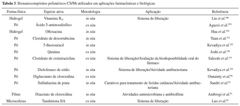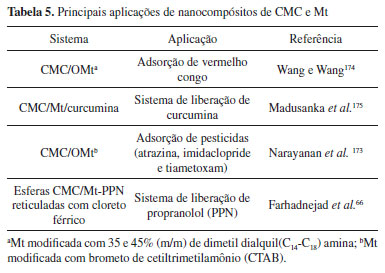 A obtenção de bionanocompósitos poliméricos baseados em celulose e Mt organicamente modificadas também tem sido relatada na literatura. Mahmoudian et al.103 prepararam fibras de celulose regenerada e uma Mt modificada com octadecilamina (OMt), empregando o acetato de 1-etil-3-metilimidazólio como solvente, via processo de fiação úmida. A ausência do pico de difração basal da Mt nos materiais obtidos indicou a esfoliação das lamelas do silicato na matriz polimérica, e as fibras apresentaram morfologia superficial lisa, de acordo com os resultados obtidos pelas análises de DRX e MEV, respectivamente. Os resultados sugeriram uma boa interação entre as espécies, atribuída às moléculas de octadecilamina intercaladas na Mt, que promovem melhor interação com o polissacarídeo, por meio de ligações de hidrogênio. Uma vez que os métodos comuns de regeneração da celulose levam à formação de estruturas porosas e amorfas, ideais para o crescimento bacteriano, concebe-se que a obtenção de uma superfície lisa é fundamental, sobretudo quando os bionanocompósitos poliméricos são destinados a aplicações em produtos como alimentos, embalagens ou materiais biomédicos.42,165 Nessa direção, Demircan et al.42 avaliaram a capacidade dos bionanocompósitos poliméricos de celulose e OMt de inibir o processo de quorum sensing das bactérias, o qual está relacionado à comunicação entre as células bacterianas, mediada por moléculas sinalizadoras extracelulares, denominadas autoindutoras. A celulose foi dissolvida em uma solução de LiCl/N,N-dimetilacetamida, e os bionanocompósitos poliméricos, preparados com 1, 3 e 5% em massa de Mt, utilizando o etanol como coagulante. Os resultados de DRX indicaram, igualmente, certo grau de esfoliação das lamelas, nomeadamente para o material com menor quantidade de OMt. Porém, a presença do pico de difração basal ainda foi observada nos difratogramas de raios X em 2θ = 3,59° (d001 = 2,46 nm), inferior ao da OMt (2θ = 4,85º, d001 = 1,82 nm), indicando a presença de estruturas intercaladas. A interação entre as espécies, por meio de ligações de hidrogênio, foi verificada em virtude do deslocamento da banda νO-H para regiões de alta frequência nos espectros de infravermelho dos bionanocompósitos poliméricos, e as imagens obtidas por MEV apontaram que entre as composições, aquela com 1% em massa de OMt apresentou morfologia de superfície mais lisa, provavelmente devido à melhor interação com as lamelas da OMt. Os bionanocompósitos poliméricos revelaram um efeito anti-quorum sensing contra a bactéria C. violaceum CV026, e embora o mecanismo de inibição ainda não tenha sido elucidado, o melhor resultado exibido para a composição com 1% em massa de OMt pode estar relacionado à estrutura formada. No entanto, vale salientar que as características encontradas nos bionanocompósitos poliméricos obtidos com OMt podem estar relacionadas ao método de síntese e à quantidade das espécies utilizadas. Todavia, os trabalhos denotam que tanto o método de síntese utilizado quanto a escolha das matrizes iniciais devem ser adotados de acordo com a aplicação destinada. Embora em menor quantidade, aplicações como adsorção de corantes166 e regeneração de tecidos167,168 são descritas para os nanocompósitos de celulose/Mt. Outras aplicações utilizam derivados da celulose solúveis em água para obtenção de bionanocompósitos poliméricos com a Mt. Entre eles, a carboximetilcelulose (CMC) é um polissacarídeo aniônico e hidrofílico que apresenta grupos carboximetil substituindo parcialmente as hidroxilas nas posições 2, 3 e/ou 6 na estrutura da celulose.169-171 Seu uso associado às argilas tem sido destinado tanto à produção de filmes e membranas com melhores propriedades térmicas, mecânicas e de barreira,19,162,172 quanto à obtenção de materiais funcionais para aplicações em adsorção de poluentes e sistemas de liberação de fármacos, como mostrado na Tabela 5. Nesse sentido, a preparação de bionanocompósitos poliméricos é realizada com o intuito de alcançar melhor interação entre as espécies, que pode ser atingida a partir de argilas organicamente modificadas173,174 ou adição de reticulantes.66,93