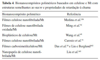 O mecanismo de interação entre a celulose e os argilominerais ocorre, principalmente, por intermédio de ligações de hidrogênio e forças de van der Waals,40 e a maioria dos trabalhos são destinados à obtenção de materiais com melhores propriedades de barreira, mecânicas, ópticas e retardamento de chama com potencial uso em indústrias elétrica, de alimentos e embalagens.42,43,72,158,159 Com isso, os diversos métodos de síntese geralmente avaliam o efeito da quantidade de Mt na estrutura do bionanocompósito polimérico e, consequentemente, nas propriedades finais. A propósito, Wang et al.43 desenvolveram bioplásticos baseados em bionanocompósitos poliméricos de celulose/Mt, aplicando um método sol-gel e prensagem a quente. A metodologia experimental consistiu, inicialmente, na dissolução do biopolímero em uma solução de LiOH/ureia, seguida de dispersão de certa quantidade de Mt, coagulação com etanol e prensagem do gel formado a 110 °C, originando bionanocompósitos poliméricos contendo 5, 10 e 20% em massa do argilomineral. De acordo com os resultados colhidos por MET e DRX, estruturas intercaladas foram formadas, cujas distâncias basais foram de 1,8 nm para todos os materiais obtidos, superiores a da Mt (d001 = 1,4 nm). Os espectros de infravermelho mostraram que a formação do bionanocompósito polimérico foi acompanhada pelo deslocamento da banda νO-H para 3427 cm-1, inicialmente presente na celulose em 3377 cm-1, devido às interações entre as espécies, por meio de ligações de hidrogênio. Ademais, os resultados de Espectroscopia de Ressonância Magnética Nuclear de 13C indicaram que a estrutura do biopolímero foi mantida nos bioplásticos. Como resultado do efeito sinérgico das propriedades da celulose e Mt, os bioplásticos obtidos revelaram propriedades mecânicas e de barreira aos gases (N2, H2, CH4 e CO2) superiores, que variaram de forma crescente com o aumento de Mt. Todavia, diversos trabalhos têm mostrado que nem sempre as propriedades desses sistemas podem ser explicadas apenas com base na variação da quantidade dos constituintes.19,73,158,160 Em seu trabalho, Yang et al.73 prepararam filmes de bionanocompósitos poliméricos de celulose/Mt com diferentes proporções, pela dispersão do biopolímero a uma solução de LiOH/ureia/água contendo o argilomineral (5, 10, 15 ou 20% em massa), seguidos das etapas de regeneração em acetona, lavagem com água e secagem à temperatura ambiente. Tais bionanocompósitos exibiram melhores propriedades térmicas, mecânicas e de barreira ao O2 em relação aos filmes de celulose pura. No entanto, o filme contendo 15% em massa de Mt apresentou maior valor de resistência à tração (187 MPa) e ao módulo de Young (6,1 GPa), além de menor teor de umidade e coeficiente de dilatação térmica em relação às outras composições. Concomitantemente, a introdução da Mt forneceu aos filmes certo caráter hidrofóbico, cujas medidas de ângulo de contato evidenciaram valores máximos de ~73° para aqueles com 10 e 15% em massa do argilomineral, superior ao observado para os outros filmes de celulose/Mt e celulose pura. Os materiais foram caracterizados, inclusive, por DRX e MEV, cujos resultados obtidos apontaram aumento do espaçamento basal inicial da Mt de 1,2 nm para até 1,6 nm, no bionanocompósito polimérico alcançado com maior quantidade do biopolímero, e nanoestruturas lamelares paralelas à superfície do filme, respectivamente. Essa dependência não linear entre as propriedades mecânicas dos bionanocompósitos poliméricos e o conteúdo da Mt pode ocorrer devido às diferentes organizações estruturais (orientação e distribuição das partículas de Mt), à formação de tactoides e nanoporosidade, que podem ser observadas no material e variam em consonância com o teor do argilomineral.158,161 Esses resultados revelam que existe uma composição ideal na qual é possível obter um efeito sinérgico máximo de determinada propriedade, e melhor análise desses sistemas deve ser realizada com vistas a uma compreensão mais acurada das propriedades finais observadas. Dessa forma, as estruturas formadas desempenham um papel notável no ponto de vista aplicativo, dentre elas, aquelas biomiméticas semelhantes ao nacre ou do tipo tijolo e argamassa denotam uma propriedade especial de barreira aos gases e resistência à chama. A Tabela 4 ilustra alguns desses bionanocompósitos poliméricos.