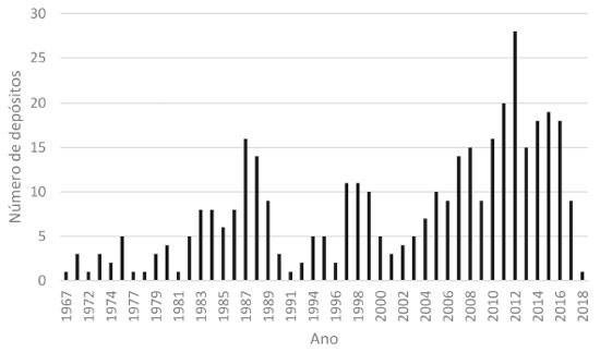 Outros índices de desenvolvimento tecnológico, são largamente discutidos na literatura2,23,24 a saber: Revealed Technology Advantage, Specialization Index, Revealed Patent Advantage Index, C20 Concentration Index, Generality of a patent, Foreign ownership of domestic inventions podem ser largamente utilizados com os dados obtidos pelos códigos INID. Não entraremos em detalhes sobre esses indicadores no artigo por se tratar de uma análise mais sofisticada e com a interpretação dos resultados quase sempre atreladas a um profissional da área da economia. Porém, para análises mais robustas sobre o desenvolvimento e uma possível aceitação pelo mercado de uma determinada tecnologia, é altamente recomendável que se faça um estudo setorial ou tecnológico mais completo, conforme finalidade determinada no início do processo. Exemplificação da construção de um panorama tecnológico sobre terras raras no Brasil De forma a ilustrar algumas das possibilidades de construção de um cenário das tecnologias sobre terras raras no Brasil, apresenta-se abaixo algumas das análises possíveis de serem feitas, utilizando informações de patentes. Para facilitar a compreensão da análise e minimizar o volume de dados a ser trabalhado, o big data foi avaliado em um contexto micro. Segundo o Guidelines for preparing Patent Landascape Reports publicado pela WIPO em 20156 as análises dos documentos de patentes podem ser divididas nos níveis macro, quando se analisa volumes maiores que 10.000 documentos; análise meso, quando se trabalha entre 1.000 e 10.000 documentos; análises micro quando se trabalha com menos de 1.000 documentos. O leitor poderá verificar que no exemplo abaixo nem todos os indicadores foram utilizados. Por se tratar de uma análise exclusivamente feita para tecnologias depositadas no Brasil, foram excluídos indicadores que se utilizam de variáveis dependentes de depósitos em outros países, como PatT, por exemplo. Outros indicadores foram omitidos apenas por conveniência e limitação de espaço. Caberá ao analista utilizar tais quais ou tanto quantos indicadores sejam necessários para que se tenha o panorama tecnológico que se deseja analisar. Perfil do patenteamento de tecnologias relacionadas a terras raras no Brasil No dia 07 de abril de 2020 foi feita uma busca no site www.lens.org utilizando as palavras chave "terras raras" em all fields e limitando a busca por jurisdiction "Brasil". Foram recuperados 439 depósitos de patentes, representando 374 famílias de patentes. Conforme explicitado anteriormente, apenas as famílias de patentes foram analisadas, uma vez que o grande grupo de patentes inclui repetições das tecnologias que foram depositadas em outros países. Como a análise possui o foco específico em depósitos feitos no Brasil, não faria sentido analisar o grupo de 439 documentos para verificar panoramas tecnológicos fora do país. A Figura 2 se refere à construção da série histórica de depósitos no Brasil. Nota-se que não há nenhuma tendência que possa ser, em um primeiro momento, facilmente identificada. A transdisciplinaridade pode ser verificada neste momento, uma vez que aspectos técnicos, históricos, econômicos e até mesmo políticos, deveriam ser cruzados com os dados obtidos na análise da série histórica para entender melhor a razão dos picos e vales ilustrados na Figura 2.
