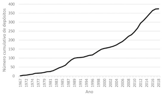 De forma a tentar prever a saturação tecnológica do que está apresentado nas patentes de terras raras no Brasil, o gráfico da Figura 3 foi construído utilizando o número acumulado de depósitos de patentes por ano. A partir da análise desse gráfico, diversos ajustes matemáticos podem ser feitos para se tentar prever o "futuro" do desenvolvimento nessa área. No livro de Porter et al.,22 publicado em 2011, vários desses ajustes matemáticos, bem como equações, vantagens e desvantagens de se utilizar um ou outro método poderá ser encontrado.
