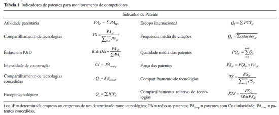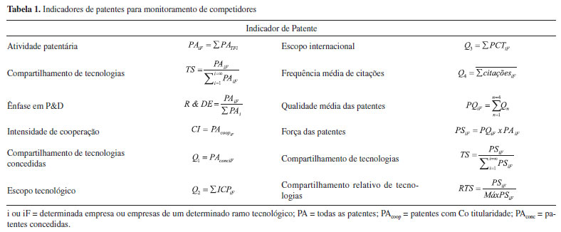 ![]() A relação de três ou mais variáveis obtidas dos códigos INID gerará vários tipos de indicadores de ordens superior conforme a necessidade do analista. Indicadores de patentes para monitoramento de competidores Alguns indicadores de inovação são mais sofisticados e, normalmente, derivam das análises da área econômica. Por outro lado, indicadores como especialização tecnológica e qualidade de patentes são menos complexos e muito utilizados para o monitoramento dos atores envolvidos na produção da tecnologia, ou do setor tecnológico em análise. A Tabela 1 traz alguns desses indicadores desenvolvidos pelo professor Holger Ernst.3