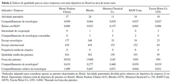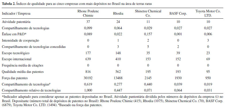 Para a análise da Figura 7, devem ser excluídas as chamadas palavras "stop words", como elementos de ligação, por exemplo. A recorrência das palavras categorizantes dos tipos de proteção - método, preparação, composição, produção, e outras, sempre serão termos de alta relevância, uma vez que aparecem em praticamente todos os tipos de patentes. Ainda dentro dessa nuvem de palavras, é facilmente perceptível a recorrência dos termos "catalisador", "liga", "aço". Esse tipo de análise pode e deve ser cruzado com a análise dos IPC, a fim de detectar quais campos tecnológicos possuem maior relevância para o setor analisado. A utilização de ferramentas mais sofisticadas possibilita o cruzamento dos dados para formar análises de rede social e nós, que permitem detectar possíveis gargalos e possibilidades de interação entre tecnologias. Assim, é possível obter novas e mais completas análises das tecnologias, bem como detectar possibilidades de geração de novos negócios e interações entre agentes internos e externos. A literatura já dispõe de diversos tipos de trabalho nesse contexto, e para não ser muito extensivo no presente artigo, recomenda-se a leitura cuidadosa dos trabalhos de Aaldering et al.25 e Pereira et al.26 Os cinco mais expressivos depositantes de patentes na área analisada foram avaliados segundo os indicadores propostos pelo professor Holger Ernst. Os dados estão expressos na Tabela 2 e a visualização gráfica pode ser conferida na Figura 8. A Figura 8 foi normalizada para melhor visualização dos eixos. Pelos índices analisados a empresa Rhone Poulenc Chimie é a que apresenta um índice médio maior de qualidade de patentes. Novamente, a transdisciplinaridade é uma ferramenta fundamental nesse tipo de análise, uma vez que podem ser incluídos aqui dados econômicos dessas empresas de forma a aumentar a qualidade do mapeamento. Dados de produção tecnológica obtidos pelos índices de patenteamento, cruzados com dados de participação de mercado, ativos intangíveis, P&D, dentre outros, quando analisados em conjunto, podem indicar o grau de utilização do segredo industrial como estratégia de proteção dos resultados de P&D das empresas.