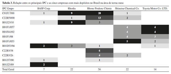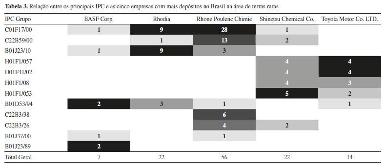 Relacionando os principais IPC (Figura 6) e os mais expressivos depositantes (Tabela 2), é possível estabelecer uma matriz de relacionamento para identificar a concentração tecnológica dos atores envolvidos e comparar o foco de desenvolvimento das tecnologias que envolvem as terras raras. Por meio da Tabela 3 é possível visualizar que, embora o campo macro tecnológico seja o mesmo, existem diferentes concentrações tecnológicas dos IPC por empresa. Verifica-se com esse tipo de análise, por exemplo, que as empresas Rhodia e Rhone Poulenc Chimic possuem foco de desenvolvimento no campo C01F17/00, enquanto a BASF possui predominância nos campos B01D53/94 e B01J23/89. A construção deste tipo de cenário possibilita uma comparação de concorrentes mais específica, além de um maior detalhamento de P&D&I da empresa, que pode ser complementado com dados econômicos, políticos, mercadológicos e de outras propriedades intelectuais.