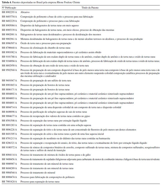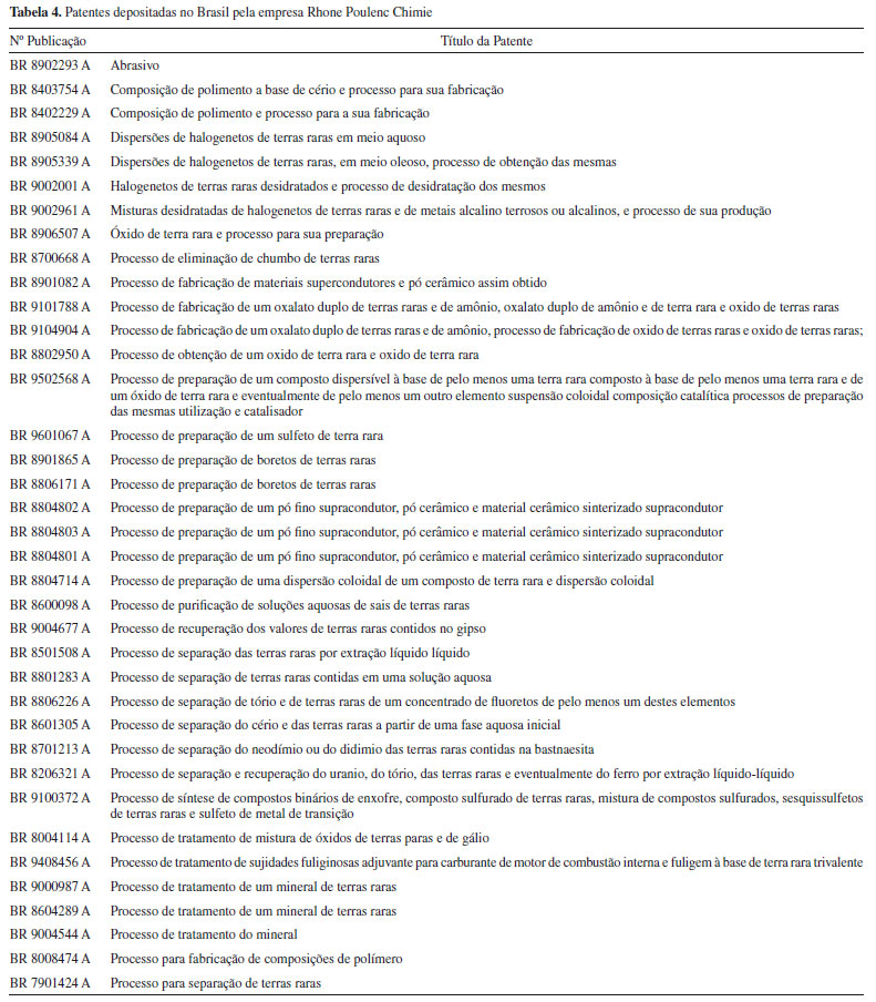 Documentos complementares ajudarão em uma interpretação mais assertiva do panorama das tecnologias em terras raras depositadas no Brasil. São eles: o artigo publicado na revista in the mine (2018), de Mathias Heider;27 o artigo publicado na revista Química Nova (2014), de Paulo C. de Sousa Filho e Oswaldo A. Serra,28 e o trabalho publicado pelo Centro de Gestão em Estudos Estratégicos do MCTIC (2013).29