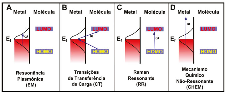 Nas seções seguintes serão discutidos com mais detalhes os fatores que influenciam a intensidade do espalhamento Raman em cada um dos mecanismos químicos de intensificação descritos acima.