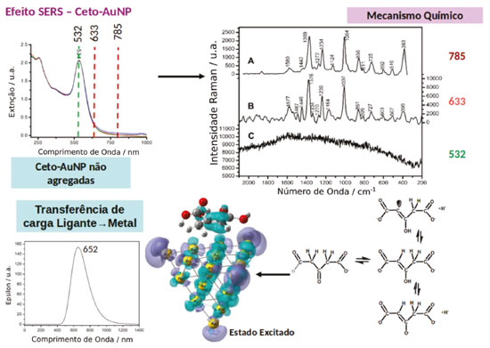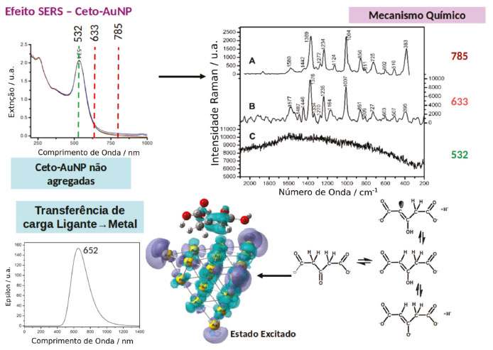 ![]() Figura 4. Efeito SERS em AuNP estabilizadas com acetonadicarboxilato. (a) Espectro de extinção de uma suspensão de ket-AuNP. (b) Espectro SERS de nanopartículas isoladas de ket-AuNP adquiridos com diferentes comprimentos de onda de excitação. (c) Equilíbrio ceto-enólico presente na acetona dicarboxilato e representação do estado excitado teórico para um complexo Au20-ket considerando excitação em 633 nm. Superfícies ciano representam a localização de elétrons e superfícies roxas a localização de buracos. Adaptado da referência 23