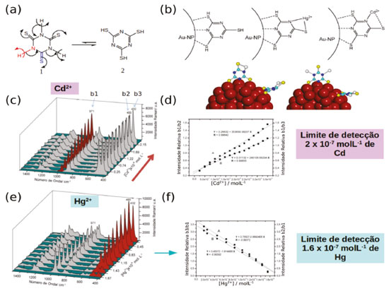![]() Figura 5. AuNP funcionalizadas com tmt para detecção de metais pesados. (a) Equilibrio tiol-tiona presenta no tmt. (b) Modos de coordenação do tmt na superfície de AuNP e sua interação com metais pesados. (c) Espectro SERS de tmt-AuNP na presença de Hg2+ em diferentes concentrações. (d) Curva de calibração para tmt-AuNP na presença de Hg2+mostrando o limite de detecção. (e) Espectro SERS de tmt-AuNP na presença de Cd2+ em diferentes concentrações. (f) Curva de calibração para tmt-AuNP na presença de Cd2+mostrando o limite de detecção. Adaptado da referência 71