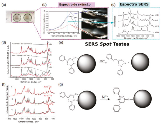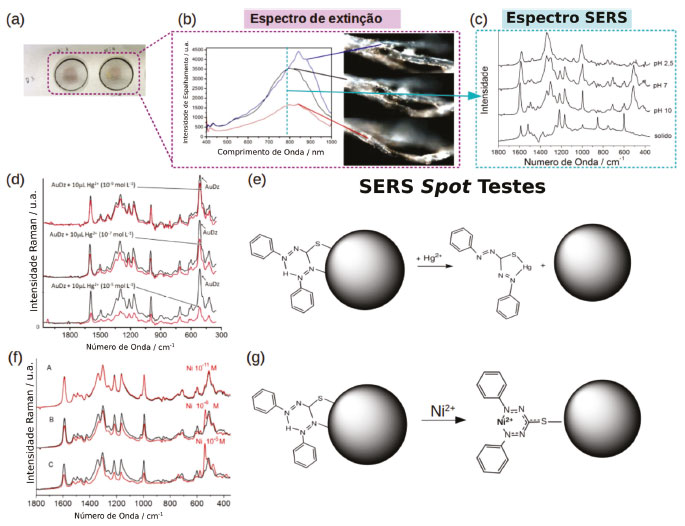 ![]() Figura 6. SERS spot testes com AuNP funcionalizadas com ditizona: (a) Imagem do papel filtro impregnado com dtz-AuNP. (b) Imagem de microscopia hiperespectral de campo escuro e espectro de espalhamento das fibras de celulose do papel filtro mostrando a presença de agregados de dtz-AuNP. (c) Espectro SERS do spot mostrado em (a) para diferentes valores de pH e comparação com o espectro Raman da dtz sólida. (d) SERS spot teste para detecção de Hg2+.(e) Esquema da reação de coordenação de ions Hg com a dtz. (f) SERS spot teste para detecção de Ni2+.(e) Esquema da reação de coordenação de ions Ni com dtz-AuNP. Adaptado da referência 9