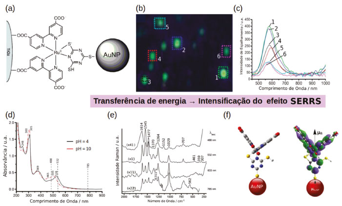 EFEITO SERS DE COMPLEXOS DE METAIS DE TRANSIÇÃO A funcionalização de nanopartículas plasmônicas com complexos de metais de transição pode ser explorada de forma a construir estruturas supramoleculares automontadas que possuem propriedades distintas das espécies separadas. Nesse sentido, o centro metálico na superfície da nanopartícula pode atuar coordenando a ligação de diferentes ligantes, formando estruturas organizadas. Um exemplo dessa estratégia é mostrado na Figura 7a, nele AuNPs foram funcionalizadas com complexos de Ru com ligantes dicarboxybipiridina (dcbpy) e tmt ([Ru(dcbpy)2(tmt)]).75-77 Complexos de Ru são corantes inorgânicos comumente aplicados em células solares sensibilizadas por corantes (DSSC). Nessas células solares o corante ancorado na superfície de um eletrodo de TiO2 absorve energia da radiação solar e seus elétrons são transferidos para o eletrodo e em seguida para um circuito externo gerando uma corrente elétrica.78 Nesse caso, nanopartículas plasmônicas podem ser utilizadas para intensificar a absorção de radiação na região do visível aumentando a eficiência da célula solar.79-82 Portanto, complexos como o [Ru(dcbpy)2(tmt)] podem ser utilizados para se coordenar na superfície de eletrodos de TiO2 e a AuNP simultaneamente, conforme mostrado na Figura 7a.77 Esse sistema ilustra a ocorrência do efeito SERRS, mesmo em condições onde não se observa agregação, evidenciando o papel da ressonância de plasmon em promover a intensificação do mecanismo Raman Ressonante no complexo.76 Nesse caso o efeito de transferência de energia da partícula para o complexo de Ru através do acoplamento do dipolo elétrico da AuNP com o momento de dipolo de transição Ru→dcbpy em 528 nm (Figura 7f) é responsável pela intensificação do efeito Raman ressonante levando a um maior fator de intensificação do espectro SERS quando a excitação é feita em 532 nm (Figura 7e).