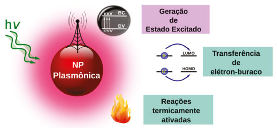 Ferrer et al. mostraram que nanopartículas de ouro funcionalizadas com complexos de ferro(II) com derivados de terpiridina (tpy), apresentam uma separação de cargas de tempo de vida longo sob excitação, e a natureza das espécies transientes depende do comprimento de onda de excitação. O autor propõe que com a excitação em 308 nm há a geração de espécies [Fe(tpyR)2]+3 e (AuNP)-1, devido à transferência de um elétron do complexo de ferro para a nanopartículas de ouro, provavelmente mediada pela formação da ligação entre a terpiridina modificada e a superfície do ouro.130 Adicionalmente, os autores mostram que essas cargas podem ser utilizadas para geração fotocatalítica de H2. Utilizando a reação de hidrogenação do p-nitrofenol com borohidreto de sódio catalisada por nanopartículas de ouro como prova de conceito Barbosa et al. mostraram que a catálise plasmônica apresenta diferentes caminhos reacionais quando as partículas estão isoladas ou suportadas em um semicondutor.131 Para partículas isoladas, após a excitação dos plasmons os elétrons excitados podem ser transferidos diretamente para o orbital desocupado do p-nitrofenol catalisando a reação de hidrogenação com o H adsorvido na superfície da AuNP, proveniente do borohidreto. Já para partículas suportadas em TiO2, devido à alta densidade de estados na banda de condução do TiO2 (Figura 13) a transferência de elétrons para o semicondutor é facilitada e observa-se a geração de H2 e a diminuição do rendimento da reação de hidrogenação do p-nitrofenol. Esse exemplo mostra de forma clara a importância de se conhecer a energia relativa dos níveis de energia da nanopartícula plasmônica, do semicondutor usado como suporte e dos reagentes no entendimento do mecanismo de reação da catálise plasmônica. As nanopartículas também podem ser suportadas em materiais bidimensionais, como o grafeno e seus derivados, nesse caso as propriedades catalíticas podem ser aprimoradas, devido à alta área superficial, estabilidades química e térmica e a influência dos bandgaps ajustáveis de materiais como o grafeno.132,133 O bandgap dos derivados químicos de grafeno pode ser modulado pelo seu grau de oxidação ou dependendo a qual metal ou óxido metálico está ligado,134 fornecendo melhores semicondutores para fotocatálise135 e dispositivos de armazenamento de energia, por exemplo.136 Nos materiais híbridos de óxido de grafeno e AuNP (GO@AuNP), a folha do óxido de grafeno pode atuar como receptor de elétron ou buraco, aumentando o número e o tempo de vida das cargas excitadas.133,137 Esse tipo de material híbrido apresenta maior atividade catalítica do que as AuNPs livres na redução da o-nitroanilina a 1,2-benzenodiamina, além de atuar como melhor substrato SERS para estas moléculas.138 Wang et al. relataram a atividade catalítica de nanopartícula de ouro suportadas em oxido de grafeno reduzido (RGO@AuNP) na oxidação do p-aminotiofenol em p,p'-dimercaptoazobenzeno, envolvendo a geração de espécies reativas de oxigênio.139 Pereira e colaboradores mostraram que o híbrido de RGO@AuNP pode ser utilizado para a decomposição de compostos policíclicos aromáticos como o 9-antraldeído levando à formação de ftalatos através da geração intensificada de espécies reativas de oxigênio.140 Utilizando o mesmo reagente (9-antraldeído) Scaiano et al. mostraram que a reação catalisada por nanopartículas de ouro suportadas em micropartículas de diamante leva à formação de uma dicetona como produto principal,127 evidenciando novamente que o mecanismo de reação é dependente do tipo de material utilizado como substrato. No caso das nanopartículas suportadas em óxido de grafeno reduzido o elétron excitado na AuNP é transferido para banda de condução do RGO, onde reage com o oxigênio do ar ou as funções oxigenadas do RGO gerando espécies reativas de oxigênio que atacam o 9-antraldeído.140 Já para as partículas suportadas em diamante, a transferência de elétrons ocorre diretamente entre o antraldeído e as AuNP gerando um radical que reagirá com oxigênio molecular dando origem a um peróxido. Catalisado pela geração de calor na superfície da partícula o peróxido se decompõe na dicetona, nesse caso o suporte de diamante atua como condutor de calor facilitando a decomposição do peróxido.127 O terceiro mecanismo de transferência de energia é baseado no decaimento não-radiativo elétron-fônon e o posterior decaimento térmico dos fônons excitados, levando à geração de um intenso fluxo de calor localizado em intervalos de tempo curtos, Figura 10. Dessa forma, pode-se ter o controle espacial e temporal da taxa de aquecimento em função da irradiação da nanoestrutura. Esse fluxo de calor pode ser utilizado para a realização de reações orgânicas convencionais com o controle mais preciso da taxa de aquecimento. Assim, reações secundárias podem ser minimizadas, aumentando o rendimento dos processos. Essa abordagem vem sendo utilizada para reações de decomposição de poluentes orgânicos,141 reações de retro Diels-Alder142 e reforma a vapor de etanol, gerando H2.143 A excitação dos plasmons de nanoestruturas apresenta uma série de vantagens, como a conversão mais eficiente de energia solar em energia química. Devido às altas estabilidades fotoquímica e térmica e as altas seções de choque de extinção das nanopartículas, que são em média cinco ordens de grandeza maiores que as seções de choque dos corantes utilizados usualmente.7 Além da fácil manipulação das propriedades químicas e físicas dos nanomateriais através da alteração da composição, tamanho, forma e funcionalização.144 Contudo, há certos contrapontos. Os mecanismos de transferências de elétrons e energia entre materiais plasmônicos e substratos não são completamente entendidos, dificultando a criação de sistemas específicos e q