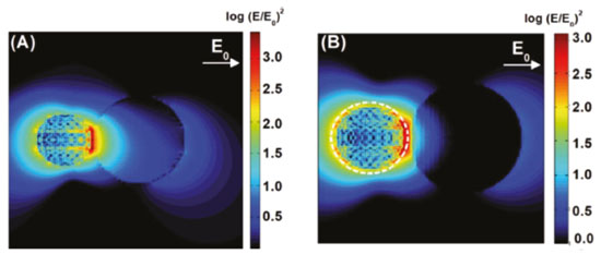 ![]() Figura 11. Mapas de intensificação de campo elétrico em sistemas híbridos de nanopartículas de Ag (30 nm de diâmetro) e de TiO2 (50 nm de diâmetro): (A) Ag + TiO2, com separação de 1 nm entre as superfícies; (B) sistema caroço@casca de Ag@SiO2, com espessura de casca de 4 nm. As simulações foram realizadas com comprimento de onda em 434 nm. Reproduzido da Ref. 124 com permissão da Royal Society of Chemistry