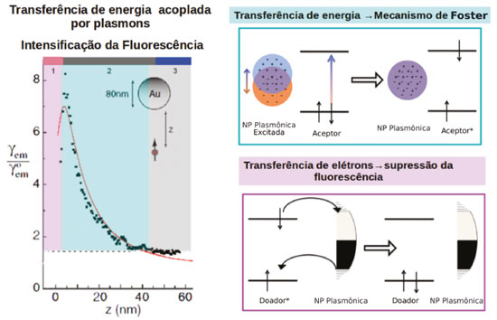 ![]() Figura 12. Tranferência de energia acoplada por plasmons. (a) Fator de intensificação da intensidade de fluorescência em função da distância do fluoróforo para a superfície de uma AuNP de 80nm. (b) Mecanismo de transferência de energia de Förster. (c) Mecanismo de supressão da fluorescência através da transferência de elétrons. Adaptado da referência 125