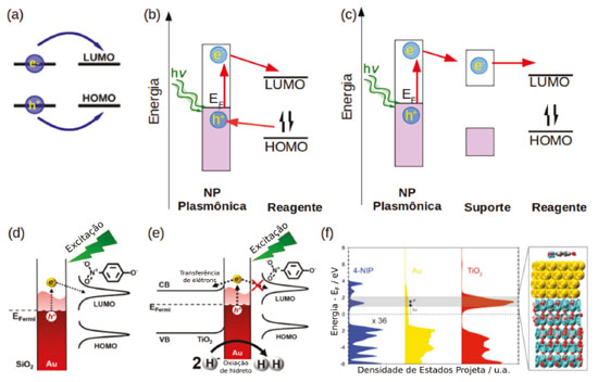 ![]() Figura 13. Catálise plasmônica por transferências de elétrons (a). (b) Mecanismo de transferência de elétrons e buracos diretamente entre a nanopartícula e o reagente. (c) Mecanismo de transferência de elétrons entre a nanopartícula plasmônica e um semicondutor de suporte e o reagente. (d) Exemplo de transferência de elétrons entre AuNP e p-nitrofenol. (e) Exemplo de transferências se elétrons em AuNP suportadas em nanopartículas de TiO2. (f) Densidades de estados calculadas por DFT para o sistema contendo AuNP, TiO2 e p-nitrofenol. Adaptado da referência 130