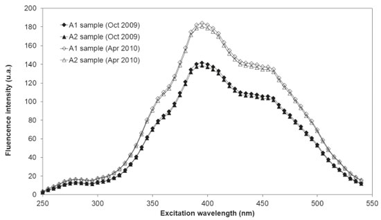 ![]() Figure 2. Synchronous fluorescence spectra for water samples of Cipó Waterfall - Itabaiana Mountains, collected during dry period (Oct 2009) and rainy period (Apr 2010)
