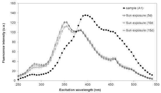 ![]() Figure 3. Variation of synchronous fluorescence spectra with sunlight exposure for the A1 water samples of Cipó Waterfall - Serra de Itabaiana National Park, collected during the dry period (Oct 2009)