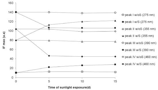 Meng et al.41, using natural organic matter sample (SRDOM, International Humic Substance Society), obtained similar results, with considerably higher fluorescence intensity peaks for the humic-like components and substantially lower fluorescence intensities for the tryptophan-like (320 - 370 nm) and protein-like (270 - 300 nm) components. For them, this confirms that the natural dissolved organic matter is dominated by humic-like constituents of terrestrial origin. As organic matter molecules are photoreactives, photodegradation is an important mechanism of DOM transformation in aquatic media, which can entail the reduction of molecular size and variation in the optical properties.25,41,57 According to Meng et al.41, photodegradation can assist identification of NOM origin, provided that NOM characteristics are associated to its origin sources. The water samples from Cipó Waterfall collected in Oct 2009 were exposed to natural sunlight for a period of 15 days. Figures 3 and 4 show the variation of synchronous fluorescence spectra and fluorescence intensities (FImax) during photodegradation experiments, respectively. The exposure to solar radiation (w/S) resulted in a decrease in the FImax of peaks at 390 nm and 460 nm, and it generated two peaks, one charactheristic of aromatic amino acid-like components (275 nm) and other associated to compounds with two tryptophan-like condensed rings (355 nm). For the samples with no sunlight exposure (w/oS), the FImax at 390 nm (Peak III w/oS) and at 460 nm (Peak IV w/oS) remained almost invariable (Figure 4), indicating that, during the period of 15 days, the fluorescent organic matter was not degraded by solar radiation.