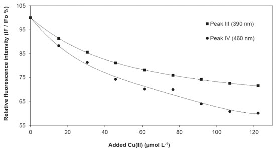 ![]() Figure 5. Decrease in intensity of peaks III and IV for DOM in the Cipó Waterfall waters as a function of the addition of 0,01 mol L-1 Cu(II) solution