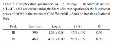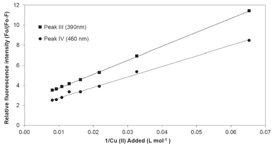 ![]() Figure 6. Stern - Volmer plot for the peaks III and IV for DOM in the Cipó Waterfall waters as a function of the addition of 0,01 mol L-1 Cu(II) solution
