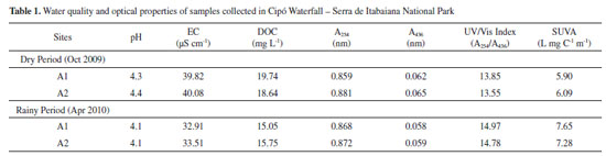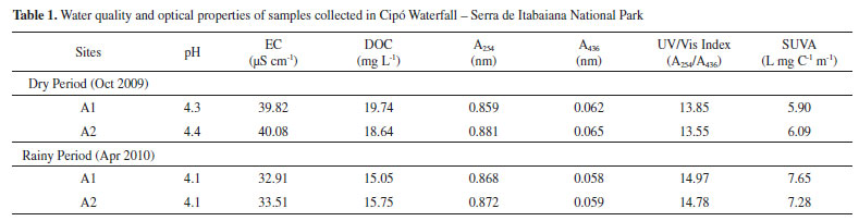 MATERIALS AND METHODS Study area, sampling and chemical analyses The study area is located in Serra de Itabaiana National Park (PARNASI), in the State of Sergipe, Northeastern Brazil. The PARNASI is a Conservation Unit formed by the mountains of Cajueiro, Comprida, and Itabaiana, covering an area of 7,966 ha in a perimeter of 87.25 km. It covers the cities of Itabaiana, Areia Branca, Itaporanga D'Ajuda, Campo do Brito, Riachuelo, and Malhador. It is located in a transition zone from Caatinga to Atlantic Forest (Brazilian ecoregions), where climate is predominantly semi-arid, with annual precipitation ranging from 1100 to 1300 mm in well-defined seasons, and monthly average relative humidity of 84.6 %. The many creeks that flows through the mountains are, in general, associated with areas of forest formation, where shrub vegetation is predominant, and they are important for supplying surrounding communities and cities, because they are springs of rivers such as Poxim, Jacarecica, and Coringuiba.47 On the other hand, Cipó Waterfall holds intertwined roots through its entire extension and it is located at Gruta da Serra, in the Itabaiana Mountains. Samples were collected from surface water, in two sites (A1 and A2) in Cipó Waterfall/Gruta da Serra (Figure 1). The water of A1 site had a longer residence time of protection from direct sunlight (shaded area), while the water of A2 site received direct influence from sunlight. Sampling was carried out in October 2009 and April 2010. In each site, water was collected in polyethylene containers and samples were kept in ice and in absence of light until it reached the laboratory. In the laboratory, pH and electrical conductivity (EC) analyses were taken, using pH meter and EC meter (Digimed, Brazil); and part of the samples were immediately filtered in glass fiber filter (porosity 0.45 µm) and stored at 4 ºC in the dark until analyses were completed. All of the used containers were cleaned with ultra pure water (18.2 MΩ.cm, Millipore) and cleansing was tested using fluorescence.