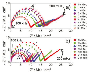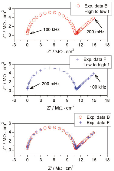 In addition to the Kramer-Kronig test, the impedance acquisition was also performed both back and forward to investigate the linearity and stability of the system.27,28 Typical results are illustrated in Figures 3a, 3b and 3c. The Nyquist plot in Figure 3a was acquired as usual, it means that the frequency varied from high to low frequency. In Figure 3b the Nyquist plot was acquired just after the previous plot (Figure 3a), but in this case the frequency was varied from low to high frequency. A good overlap of both plots can be observed in Figure 3c, confirming the stability of the system experimentally.
