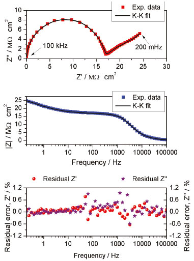 ![]() Figure 2. Kramer-Kronig test results for typical impedance data showing a good fit between the experiments (symbols) and K-K transformations. a) Nyquist plot, b) bode plots, and c) the residual error percentage for real and imaginary components