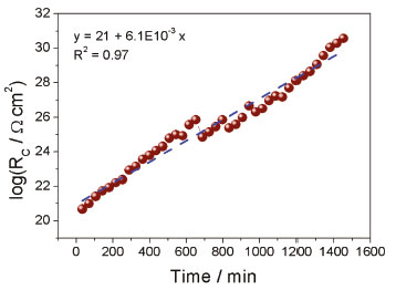 Based on the physical shape of the impedance-based sensor (parallel plate capacitor) and the shape of the plots derived from the EIS results, the equivalent electrical circuit depicted in Figure 4 was proposed for modelling and analyzing the EIS results. The main electrical components are two constant phase elements that represent the capacitive effect of the impurities on the electrode surface (CPEc) and the capacitive effect of the two parallel stainless-steel sensor (CPEb). There are also two resistances, Rc that represents the contact resistance due to the impurities that are still present during the decantation of crude biodiesel, and Rb that represents the biodiesel resistance. There is not a solution resistance because a two-electrode cell configuration was used. Figure 5 shows how the contact resistance (Rc) varies with time. An increase of Rc is observed indicating the presence of a growing highly resistive film on the electrode surface. A potential reason for this is the adsorption of impurities such as glycerol on the plates of the capacitor used as the sensor. This film limits the ion mobility near the biodiesel/SS304 plate interface which results in an increasing contact resistance.