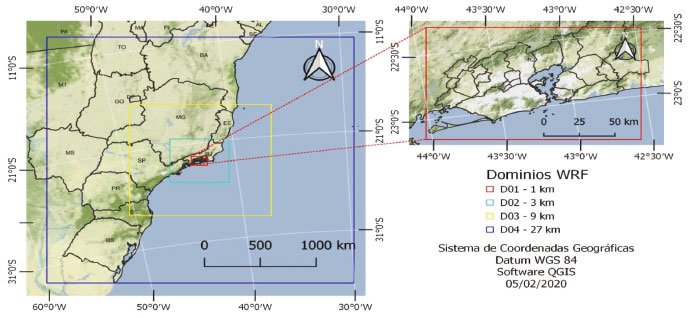 METODOLOGIA Os dados meteorológicos necessários para a validação do modelo WRF foram a obtidos nas estações meteorológicas da Secretaria Municipal de Meio Ambiente do Rio de Janeiro (SMAC) e do INEA para o mês de janeiro de 2013. De acordo com a região que iremos realizar a simulação, é necessário montar uma grade de estudo com domínios aninhados, ou seja, quadrantes que estejam contidos dentro da região de estudo. Esses domínios são importantes para melhorar a qualidade dos resultados do domínio principal.34 Grade de estudo As simulações meteorológicas foram realizadas utilizando quatro domínios aninhados descritos na Figura 1. O maior domínio (D04) apresenta resolução espacial de 27 km com 56x56 células, de área total 1512x1512 km que compreende os estados do Rio de Janeiro, Minas Gerais, São Paulo, Espírito Santo, Paraná, Santa Catarina, Rio Grande do Sul, Goiás e grande parte da Bahia, Tocantins, Mato Grosso, Mato Grosso do Sul e uma pequena parte dos estados do Pará, Maranhão, Piauí e Sergipe. Esse grande domínio possibilitando a captura das condições sinóticas e padrões circulação sobre a área de interesse. O domínio D03 possui resolução de 9 km com 82x82 células totalizando 738x738 km de área, cobrindo todo estado do Espírito Santo e Rio de Janeiro, grande parte do estado de Minas Gerais e São Paulo, além de pequenas áreas dos estados de Santa Catarina, Paraná e Bahia. O domínio D02 tem 3 km de resolução com 130x130 células com 390x390 km incluindo em sua área as partes dos estados de São Paulo, Minas Gerais, Espírito Santo e a totalidade do estado do Rio de Janeiro. O domínio D01 é o mais refinado, contendo 1 km de resolução espacial e 151x82 km área. Esse compreende toda a RMRJ e cidades vizinhas a ela. Os quatro domínios estão centrados nas coordenadas -22,81ºS; -43,24ºW. Todos os testes de parametrizações foram feitos utilizando a técnica two-way nesting em todos os domínios.25,35,36 A estrutura vertical foi representada por 21 camadas verticais, distribuídos na proporção de 1,000, 0,998, 0,995, 0,992, 0,988, 0,982, 0,976, 0,970, 0,950, 0,930, 0,870, 0,800, 0,740, 0,630, 0,540, 0,450, 0,360, 0,270, 0,180, 0,090, 0,000, sendo que o valor 1,000 representa a camada mais próxima do solo e o valor 0,000 representa a camada mais afastada do solo totalizando 15 km de distância. As parametrizações físicas utilizadas para a microfísica foi a proposta por Lin, para radiação de onda longa RRTM,37 para radiação de onda curta Dudia,38 para a camada de superfície Monin-Obukhov,39 para superfície terrestre Noah,40 para camada limite planetária YSU41 e para parametrização de Cumulus foi usado a proposição de Kain-Fristsch.42