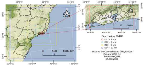 ![]() Figura 1. Representação dos domínios criados para simulação da área de estudo. A figura a direita apresenta um detalhamento do domínio D01