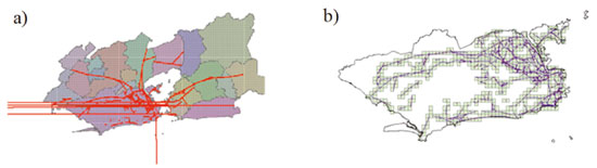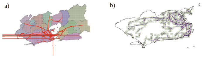 ![]() Figura 2. (a) Vias do inventário de fontes móveis na RMRJ no ano 2013. (b) Vias do inventário de fontes móveis na cidade do Rio de Janeiro no ano 2013 obtidas após correção no georreferenciamento